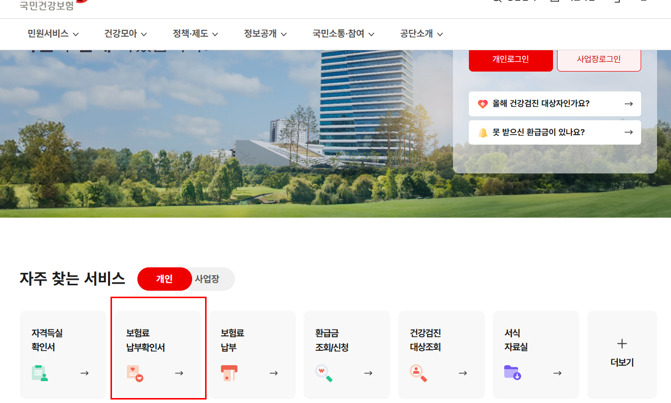 - 메인페이지 건보료 납부/ 납부확인서 메뉴 클릭